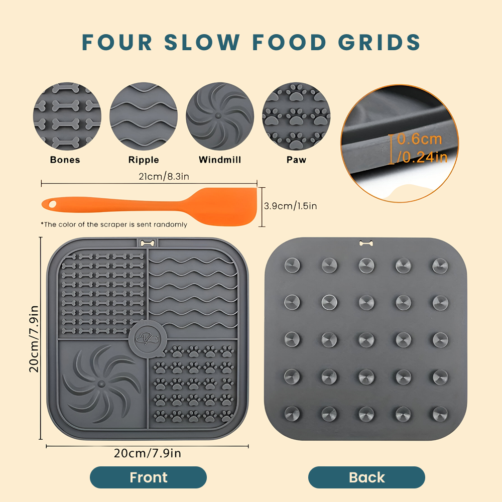 CalmTreat is a durable silicone mat designed to reduce stress and promote slower eating. Made from BPA-free, food-grade silicone, it’s ideal for wet food, peanut butter, and more. The textured surface provides mental stimulation while the strong suction cups keep it securely in place. Easy to clean, simply wash it by hand or place it in the dishwasher.